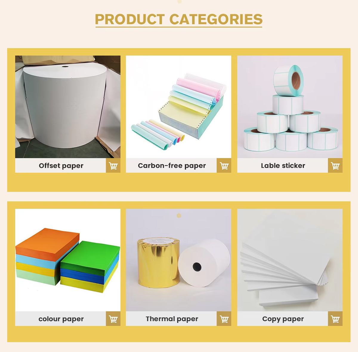 Productos principales:Papel térmico, papel de color, papel de copia sin carbón, etiqueta autoadhesiva, papel de copia